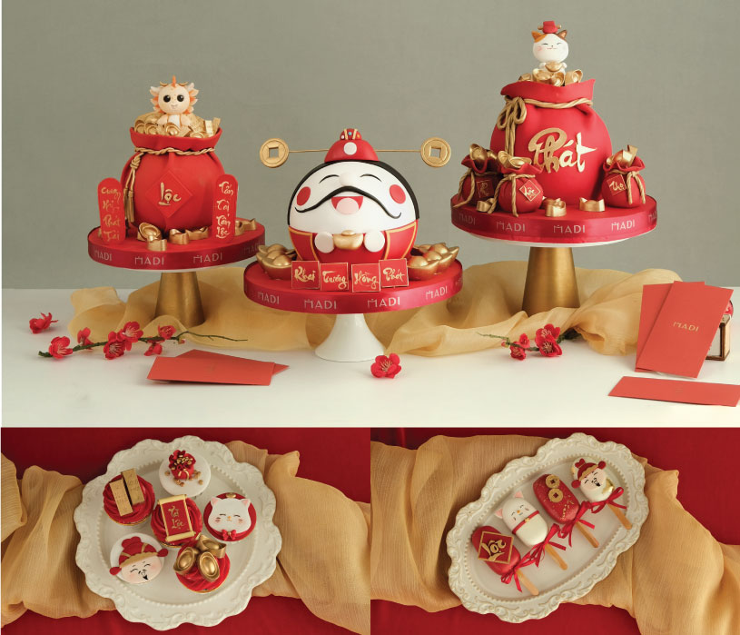 Không chỉ có những chiếc bánh kem thần tài với nhiều mẫu thiết kế độc đáo như Túi Phát tài Phát lộc, Ông thần tài may mắn, Bánh con rồng – linh vật của năm, MaDi đã thêm vào bộ sưu tập những mẫu cupcake và cake pop mới lạ, đặc biệt tháp bánh su kem đỏ khổng lồ.