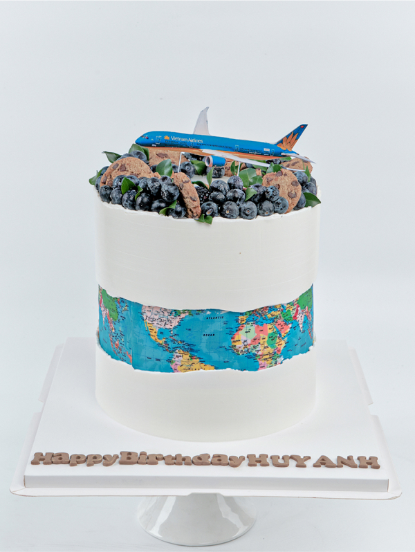 A cake design for travel enthusiasts made by the MaDi cake artisan, featuring a Vietnam Airlines airplane and a large world map.