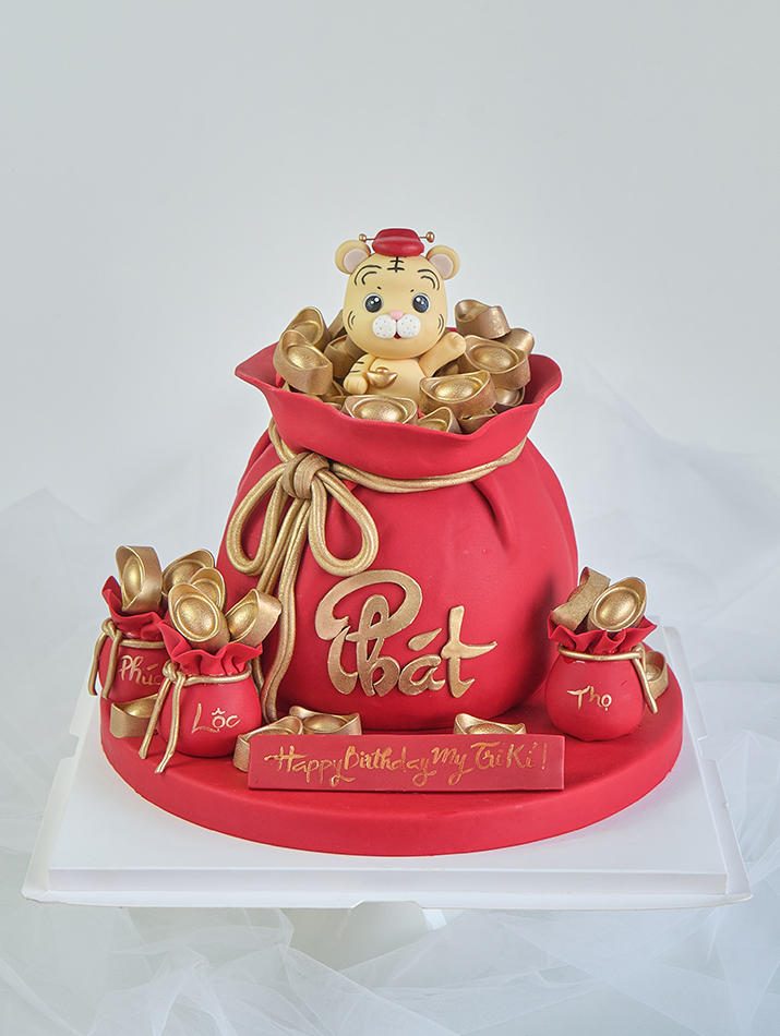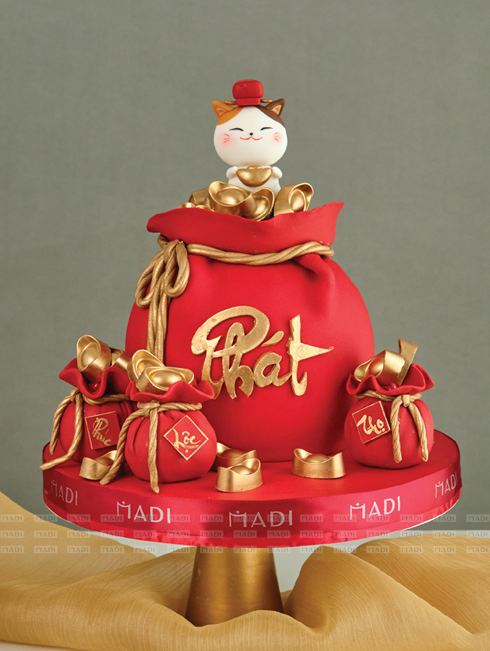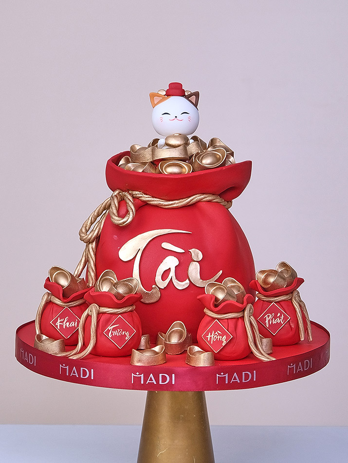 A very impressive New Year opening cake design by the MaDi cake artist. The creative combination of lucky red bags filled with gold bars and a lucky cat welcoming the new year is a highlight.