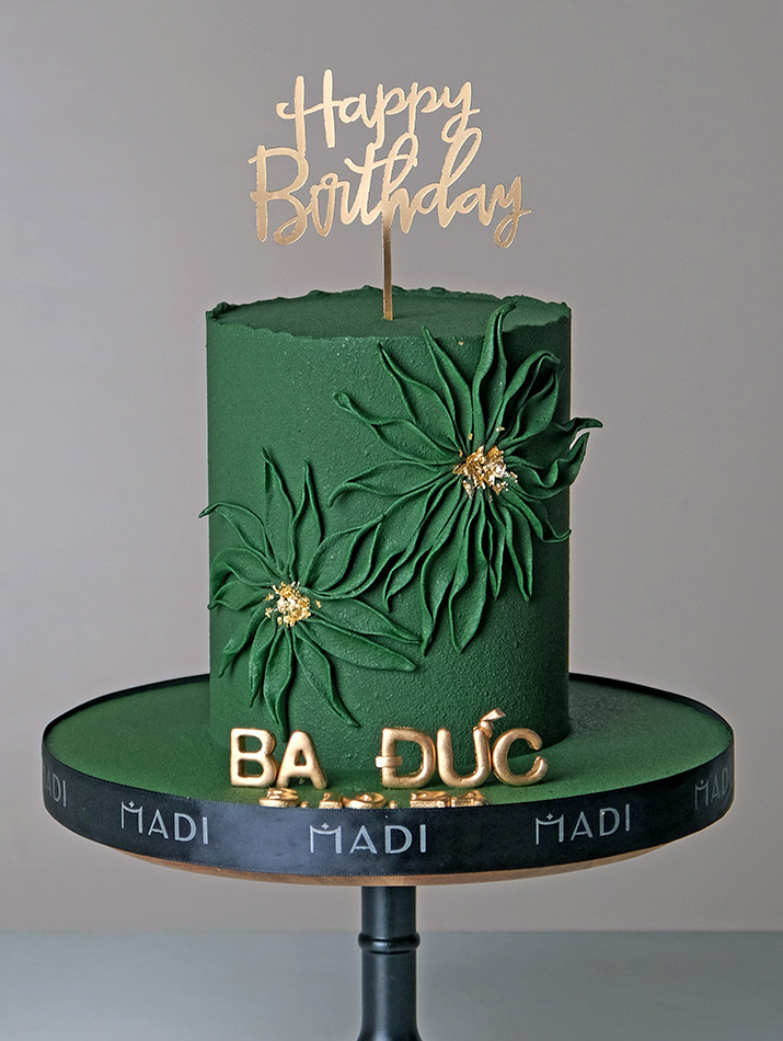 No need for elaborate patterns or striking colors, the mysterious green color with the choco surface texture, and the leaf details that are shaped on the cake background are enough to make a strong impression.