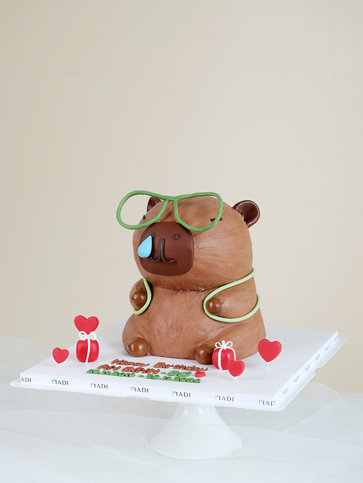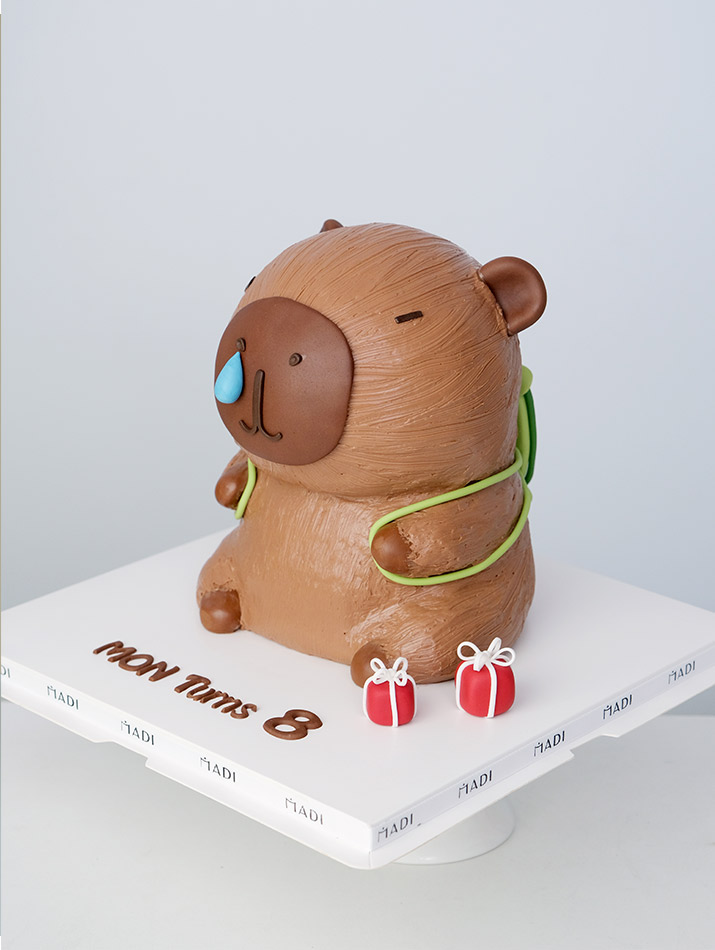 Đôi tai tròn, gương mặt ngộ nghĩnh và giọt nước mắt mũi hóm hỉnh, chiếc bánh capybara của Tiệm Bánh MaDi mang đến một vẻ ngây ngô dễ thương khó thể cưỡng lại. Cùng với chiếc balo nhỏ màu xanh nhạt tạo hình chú rùa con nằm gọn gàng trên lưng, càng làm tăng thêm sự đáng yêu và tinh nghịch cho chú capybara.