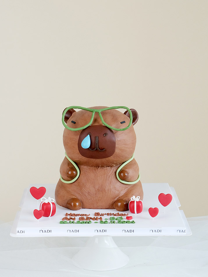 Chiếc bánh kem capybara siêu đáng yêu được trang trí sống động, dễ thương. MaDi sẽ mang đến một chú chuột capybara ngộ nghĩnh cho bữa tiệc sinh nhật của bé yêu.