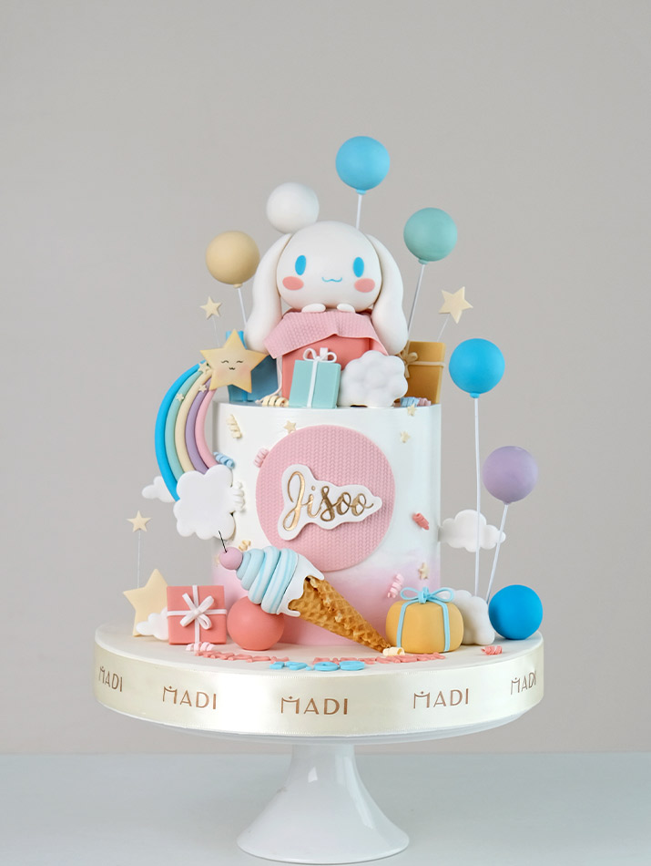Với tone màu hồng pastel dịu dàng và xanh dương tươi mát, chiếc bánh kem tạo hình Cinnamoroll xinh xắn, cùng những chiếc bong bóng, cầu vồng và quà tặng đầy màu sắc, tạo nên một thế giới cổ tích ngay trên bàn tiệc.