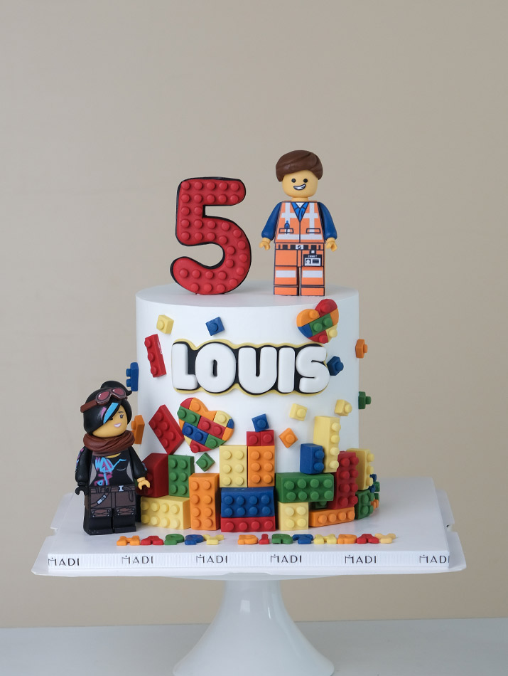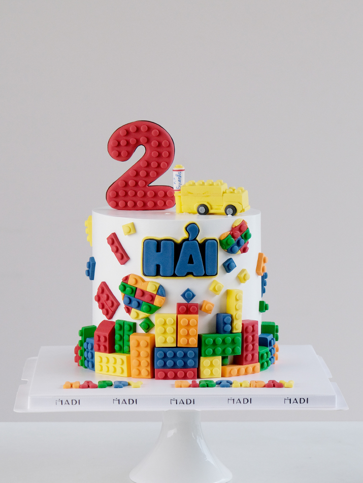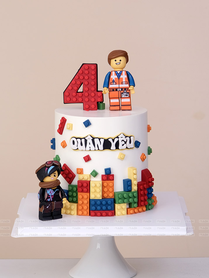Chiếc bánh kem Lego được thiết kế độc đáo và đầy màu sắc, lấy cảm hứng từ các khối xếp hình Lego quen thuộc tại MaDi